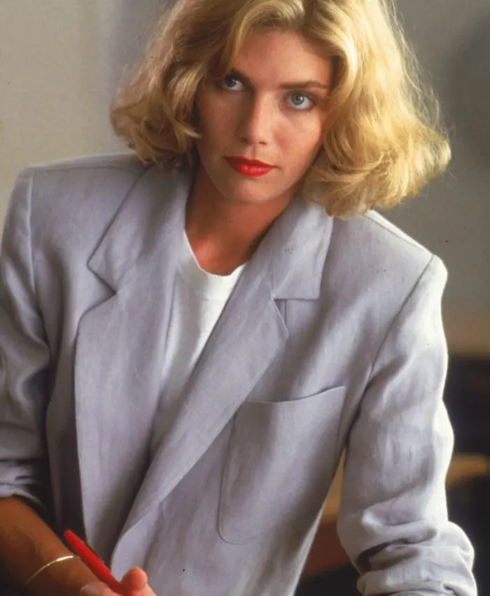Top Gun season is in buzz these days after the release of Maverick, the top gun sequel. We take you back to 1986 when Top Gun had released. It becomes an instant sensation for the fans. People love the acting, flight sequences, and outfits from the movie. Mcgillis was the lead actress in the film. She played her part brilliantly and introduced some lovely Kelly McGillis top gun costumes, which are still popular among the Top Gun fans. Look at this Top Gun 1986 Charlie Grey Cotton Blazer Coat from the movie. Kelly is looking stunning in this attire.